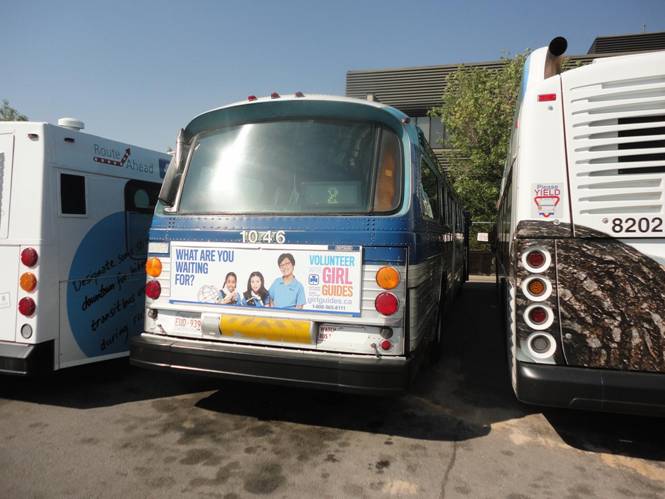 Two buses were pulled out. The first was fishbowl #1046. #1046 is the last fishbowl in service to wear the two tone blue livery. #1046 was parked beside our charter bus.
