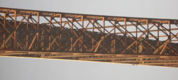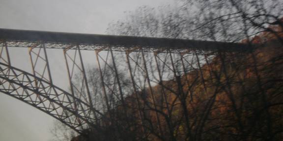 As we continued to go through the New River Gorge, our guide pointed out a cable car line which unsuccessfully tried to photograph. A little while later, we passed under a bridge which was high above us. I had heard from my friend Bill that in the early 90’s a commercial for a Chevy SUV was filmed there where the SUV bungee jumped off the bridge! I actually have that commercial on tape still as it was on a program I had taped from A&E back in 1992-1993. I took some photos of the bridge.