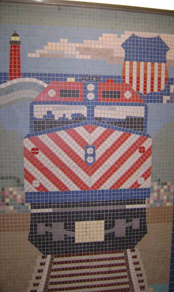 I went downstairs and saw a mosaic of a Metra locomotive. I photographed it.