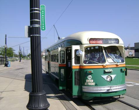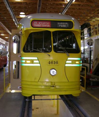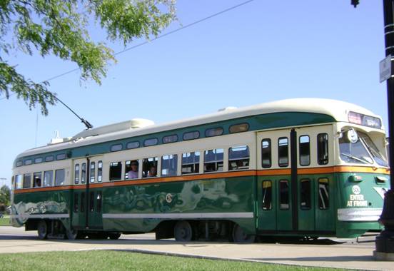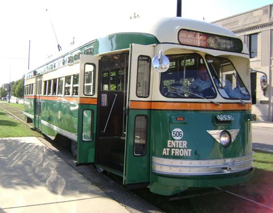 The PCC cars in Kenosha run counterclockwise on a large oval that takes 15 minutes for a car to make a trip. It costs only $0.25 to ride the car. One PCC is usually operated at a time.