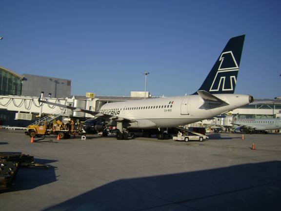 My ticket said I was boarding at gate 254. To get to that gate, I had to take a bus down to a mini-terminal located outside of the now demolished Terminal 2. I got on the bus and we drove past several Air Canada planes and an Airbus A319 from the Mexican airline Mexicana. I took some photos of some of the aircraft.