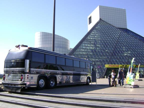 I looked at the gift shop before I walked over to the Rock and Roll Hall of Fame next door. My friend Greg and some other people recommended I visit, though I had visited on my school trip 10 years earlier. As I got there, I saw another cab from the taxi company that made me miss the Lakeshore Limited last time. I booed again. I then took a picture of the Rock and Roll Hall of Fame with Johnny Cash’s tour bus still parked in front.