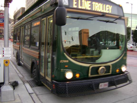 The E-line trolley is basically a Dennis SLF-200 painted green and has a “bell” on the roof and is supposed to look like a trolley car. The fare was free though and I took a ride before I got off and took some photos of the bus.