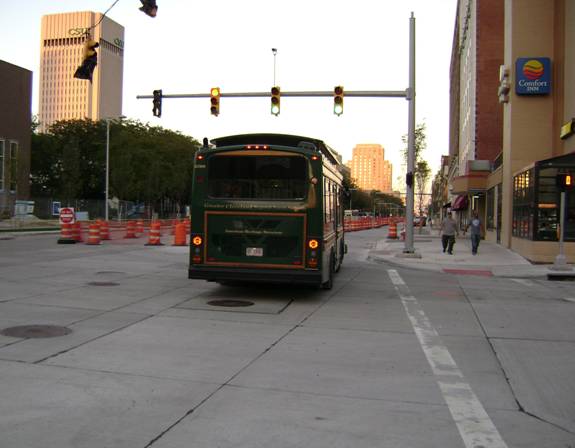 I then went upstairs and caught a route 6 bus to my hotel; the Days Inn and Suites on Euclid Avenue. This hotel is much closer to the Amtrak station, and only a few dollars more expensive. When I got to the public square, I noticed a lot of roadwork being done. After I rode to my hotel, I found out what was being done. They were building private bus lanes on Euclid Avenue.