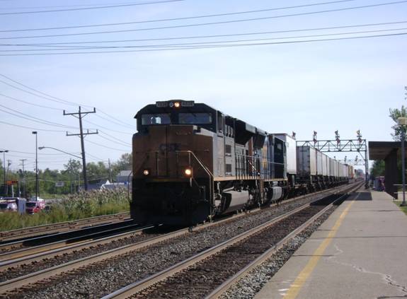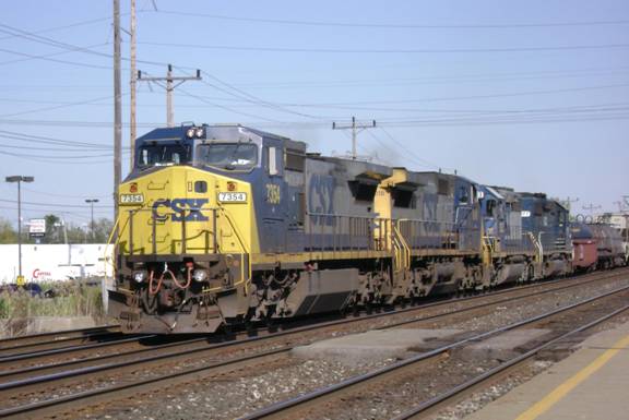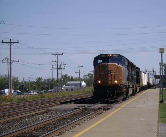 Shortly after I got onto the platform, I westbound CSX intermodel passed by on the closest track. I photographed it.