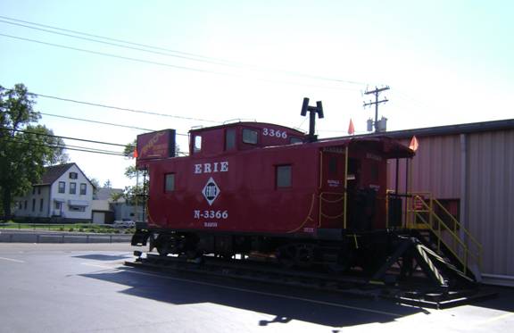 I had at least four and a half hours to kill, so I took a taxi to the Niagara Central hobby shop about a mile away. The cab driver was unsure where to go, so I pointed it out to him since I had been there in the past. When it came time to turn onto Union Road, we did, but we had to get over, but an 18-wheeler was blocking us, so we had to wait. When we did change lanes, a road-rager yelled at us. I resisted the urge to give him the finger and we arrived at the hobby store. I paid the fare and went inside the store where I left my stuff at the counter and looked around. I noticed they had a camera pointing out at the CSX main behind the store where I had just come in. I eventually bought an HO scale model of a BNSF GP38. I then went outside and photographed the former Erie caboose in the parking lot before I went inside it and looked around.