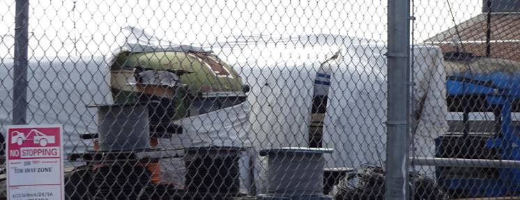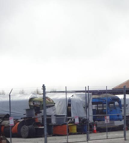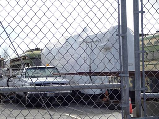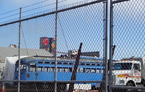 As we passed over a drawbridge, I looked off to the side and saw some Muni PCCs in storage. I got off at the next stop and made my way there. The cars were stored in a fenced in area behind some stores. Many of the cars were in the Muni wings livery. I saw one car in the “Landor” livery similar to what Flyer E800 #5300 is painted in. Many of the cars were partially covered with tarps. Others looked like shells. I took some photos.