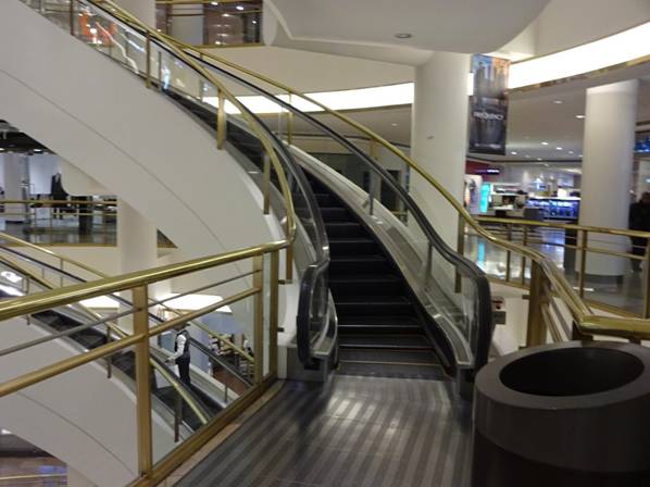 I caught a “T” line train to downtown. I made my way to a mall and looked around. I saw the mall had a unique feature: an escalator that curves! I had never seen a curvy escalator before. I photographed it.