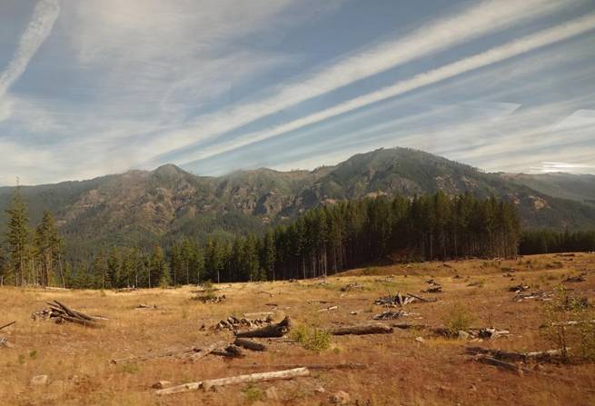 I was hoping to see the Three Sisters volcano but was unsure if I saw it or not. The train stopped in Eugene-Springfield. After we departed, I saw an Amtrak Cascades train on a siding. Eugene-Springfield is the southern most station on the Cascades service.