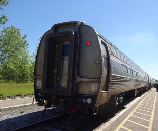 My ticket was soon taken and the cafe car opened. The equipment that would be the combined VIA trains #62 and #52 passed and I filmed them. I noticed that one of the LRC coaches was one of many wrapped for Canada's 150th birthday later this year.