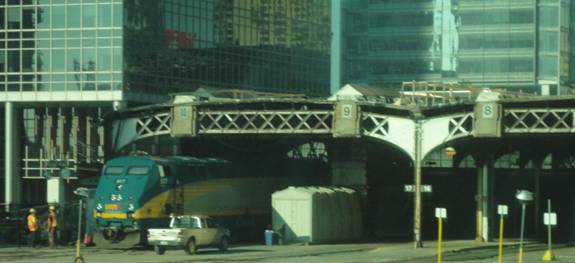 I got a window seat on the upper level of the cab car. The GO train soon departed. Just over 30 minutes later, we arrived at Union. We actually arrived a few minutes early. As we approached Union, I saw the locomotive of train 56 sticking out. I photographed it.