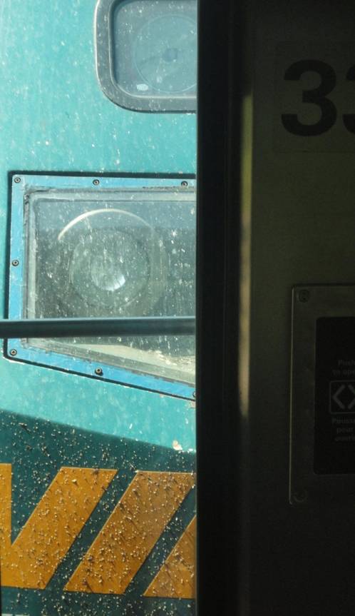The train stopped to separate trains 56 and 54. The HEP went out. I watched the procedure from the last car of train 56. When the trains were separated, I took one more photo of the locomotive on train 54.