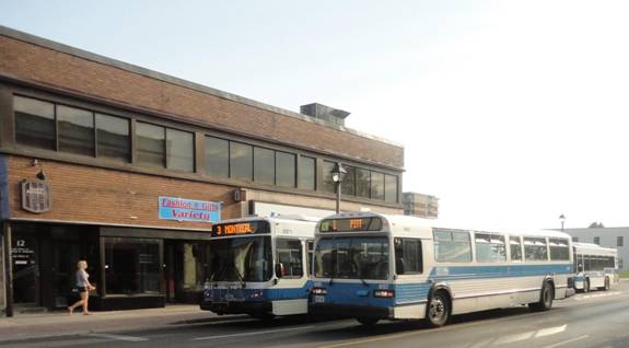 I went to my room and relaxed for awhile and I also worked on this report some more. Eventually, I decided to go out to try and ride at least one Cornwall Transit Classic. I walked a few blocks to a bus stop. While waiting, I bought a bottle of lemonade. An El-Dorado EZ-Rider showed up. I rode it to the transit center downtown. I saw a couple more EZ-Riders in service. I looked down the street and saw a Classic. It turned, but I thought it was just going to come in on a different street. I turned out to be right. The Classic was 1985 built GM Classic #8558. I photographed it before I got on.