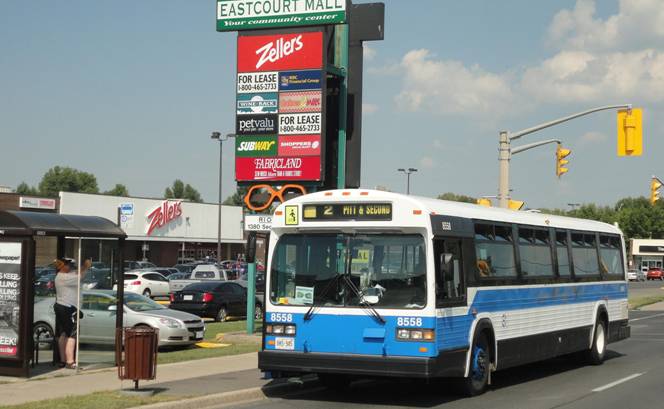 We then got on the highway and drove along it. I noticed the bus was kinda slow. We got off and had our next photo stop in front of the Eastcourt Mall. I photographed the bus with the Zellers in the background as Zellers has been bought out by Target and various stores in my area are having closing sales prior to conversion to Target stores.