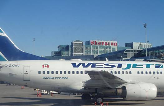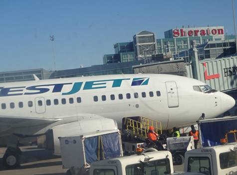 I briefly spoke to another passenger before I worked on this report some more. I decided to try to get lunch. I bought a burger near my gate. After lunch it was time to board the plane. I had heard it was a full flight. I had a middle seat. From the plane, I attempted to photograph a Westjet Boeing 737-600.