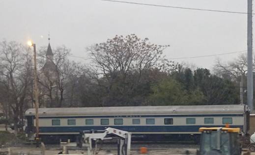 The person sitting behind me was snoring loudly. I went to the dining car for breakfast. After breakfast I returned to my coach seat. At one point, we passed passenger car painted in Missouri Pacific colours. I photographed it.