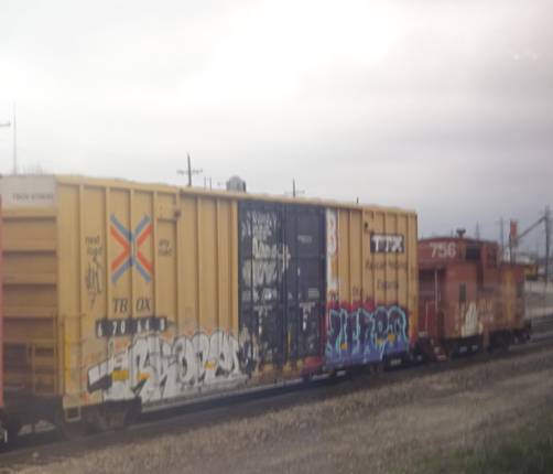 The train slowed to a crawl. We then stopped. We waited for a westbound TRE commuter train to pass. When it passed, I filmed it. We were soon underway again.