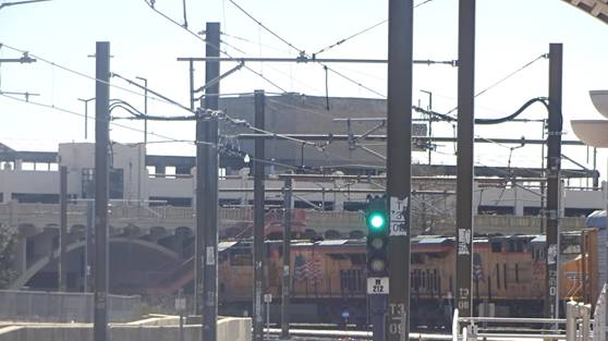 I then rode to Union Station. I saw an eastbound Union Pacific freight train was passing through. I attempted to photograph the locomotives.