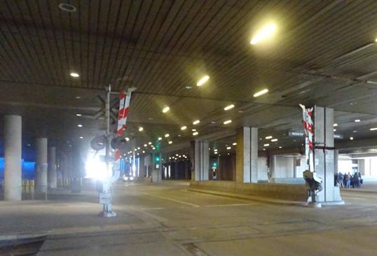 I then walked back to the station. The Convention Center is built on top of a road and the DART line. As a result, where the road crosses the DART line has a level crossing where the gates actually fold when not in use because there isn’t clearance. I photographed the crossing and filmed a train passing through.
