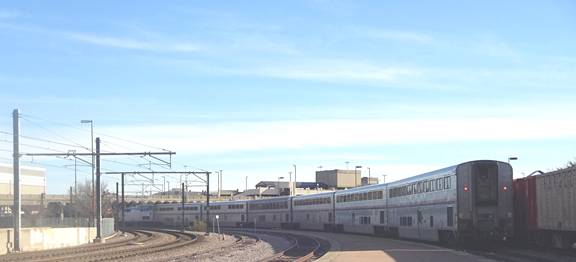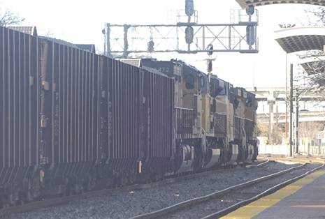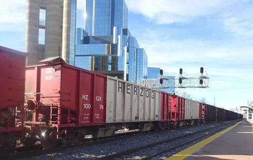Just before the Texas Eagle departed, a Union Pacific freight train with several Herzog hopper cars passed. I filmed the Texas Eagle departing.