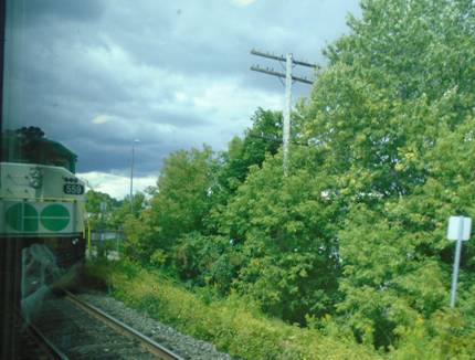 The train stopped at Guildwood. An eastbound GO train stopped on the track next to us. A westbound GO train pulled in led by F59PH #557 with F59 #559 on the rear. I attempted to photograph #559.