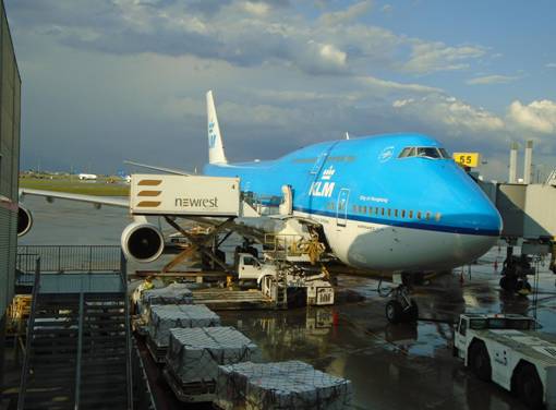 After I cleared security, I went to find my gate. I noticed my foot was a bit sore. I photographed a KLM Boeing 747-400 at the gate.