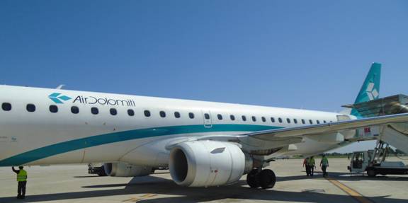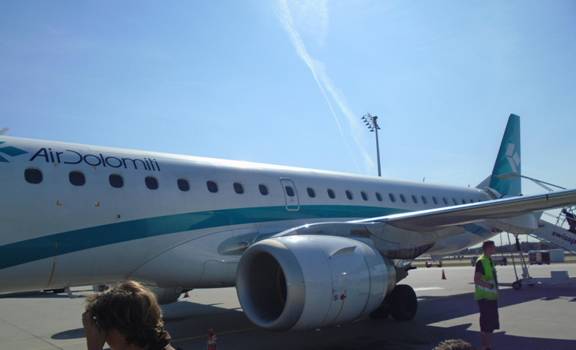 Soon, it was time to board. I had to take a bus out to my flight. My connecting flight was an Embraer 195 operated by Air Dolomiti as part of a codeshare agreement. Air Dolomiti looks like a no frills type airline. I photographed the plane before I got on.