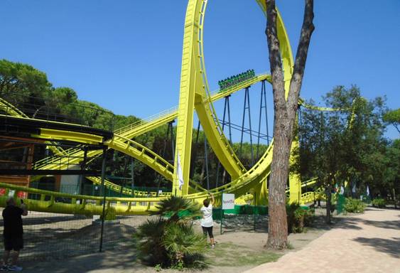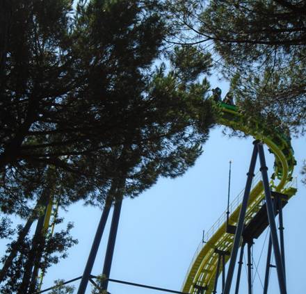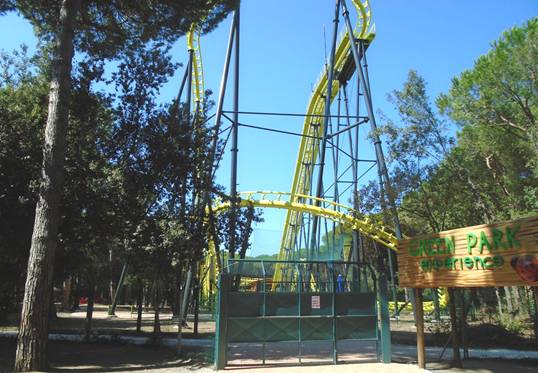 When Skyrider was at Wonderland, it had two trains; a yellow train and an orange train. At the time I took this trip, there was only one train on Freestyle in Italy; the former yellow train which had been painted green which is kinda ironic; the train was yellow and the track was green at Wonderland. At Cavallino Matto, the train is green and the track is yellow. I could tell it was the former yellow train by the restraints which still have yellow fabric on them from the train's Wonderland days. I photographed the train as it made an empty run on the line.