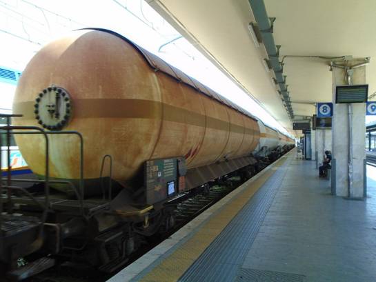 I soon left the beach and caught a bus back to the train station. I then bought a ticket back to Pisa. I went to the platform. There was a freight train stopped there. It consisted of a locomotive and 14 flat cars. I photographed the train.