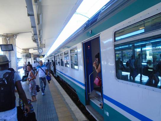 I got up at 7:00 am and got dressed. I went to the lobby for breakfast. After breakfast, I headed to the Pisa Central station. Today I would be going to Cavallino Matto. I validated my ticket to Castagneto. I went to the platform where my train was boarding. The train as sitting on the track but the doors were closed. I photographed the train while I waited to board.