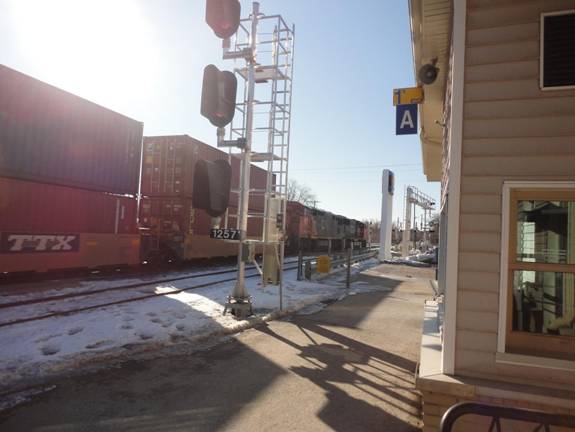 I went inside the station and changed the battery on my digital camera. I then went outside and filmed train 56 arriving. As train 56 passed through a railway crossing west of the station, it barely cleared a car that was sticking out. I photographed train 56 after it stopped.