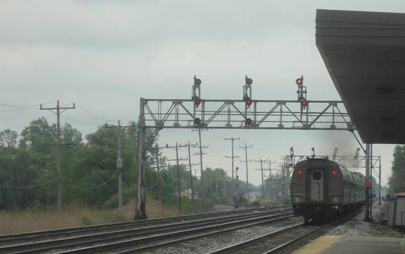 I rode to Elmhurst. As we passed Union Pacific’s Proviso Yard, I saw a train of M-8 commuter cars behind a Union Pacific diesel. I got off and saw a stopped Union Pacific intermodel train blocking the crossings. However, there was a pedestrian tunnel under the tracks which I used. I photographed a Chicago bound Metra train.
