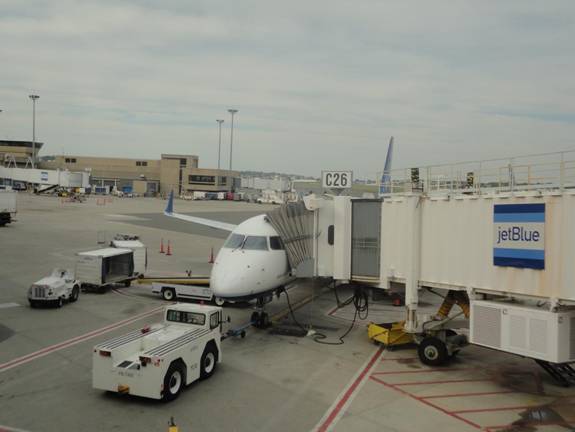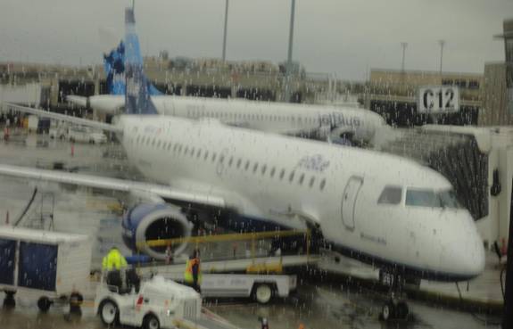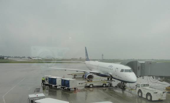 While I was at the airport, I had a 10 minute massage and logged into the airport's Wi-Fi. I went onto Facebook and wished my friend Greg in Chicago a happy birthday. I then went back to waiting. When my plane arrived at the gate, I photographed it. Once again, it was an Embraer 190.