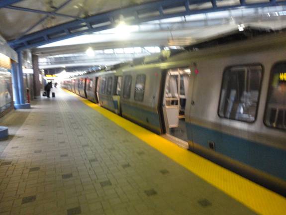 It was mostly dark, so I boarded a red line train and rode to South Station where I bought dinner. I then got back on the red line and rode to Downtown Crossing. I rode the orange line to State Street. I was hoping to ride the blue line to Bowdoin, but like last October, the train went out of service at Government Center. I photographed the train, but the picture turned out blurry.