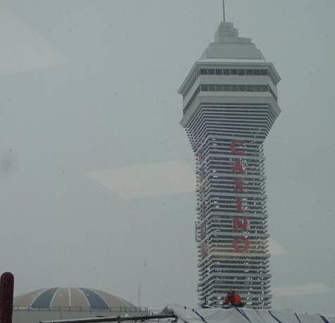 pulling away and took one more photo of it with the Great Wolf Lodge in the