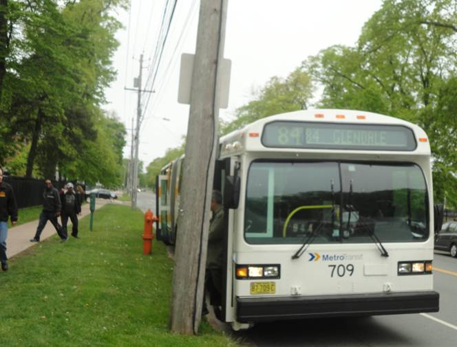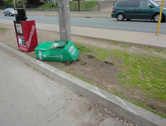 I also filmed them pulling away. Someone pointed to where a bus had mounted the curve and struck a couple newspaper boxes. I took some photos of that.