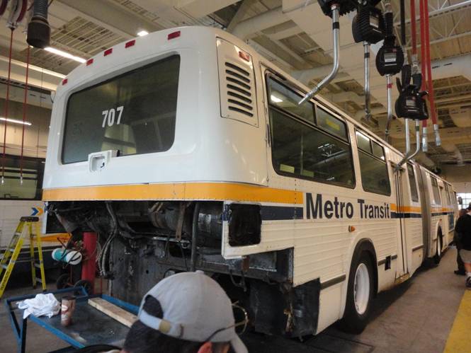 709 was moved and then I filmed the bus moving. We then got back on and then we headed off to the current Bridge Terminal where we photographed 709 and other buses that came. One of the other buses was Nova LFS articulated #717, the first LFS articulated bought by Metro Transit.