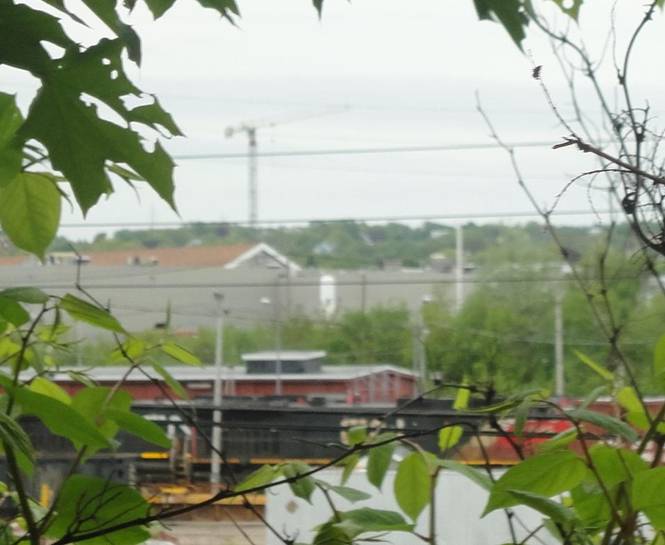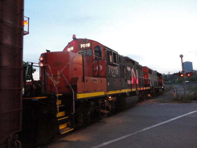I returned to my hotel and went online and worked on this report some more. I eventually went out for dinner. I caught a bus to the Bridge Terminal where I initially walked to a nearby Subway restaurant, but found it was closing. I ended up walking to the Taco Bell where I had dinner on my first night in Halifax. I donated some money into a box for charity and held the fridge door open while an employee at Taco Bell stocked it with a cart of 2 Litre pop bottles while waiting for my dinner. I then headed back to my hotel. After I got off the bus, I was about to head to my hotel when I heard a locomotive bell. I sprinted to the nearby crossing and photographed the CN switch job as it came through with a long string of autoracks.