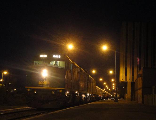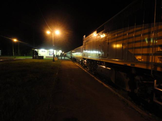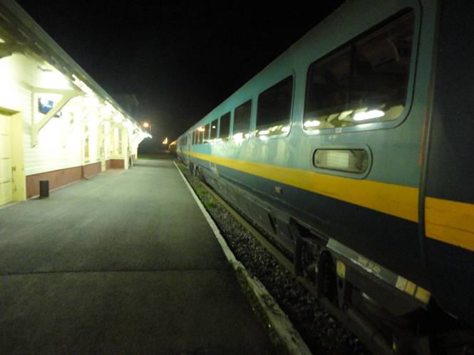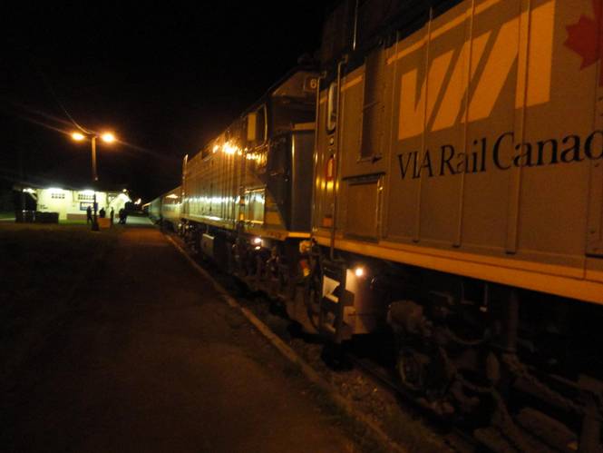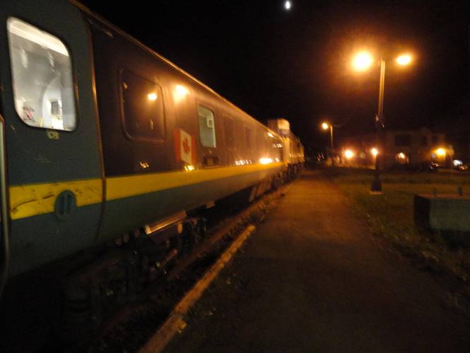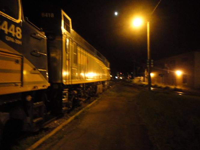It was dark out soon. At one point, we were passing through a town. We passed by a bonfire. A little later, we stopped at Campbellton. This was a smoke stop. I got off and photographed the train.