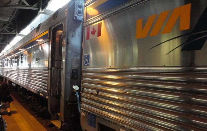 Boarding began around 9:45 am. I was seated in Hep2 coach #4108 which was the last car in the train. The HEP was out when I boarded. However, the Wi-Fi service was working and I logged into the internet. A woman saw the commuter cars for AMT's Deux-Montages line and told a VIA employee she hadn't seen trains with those type of seats. The VIA employee told her it was a commuter train what they were.
