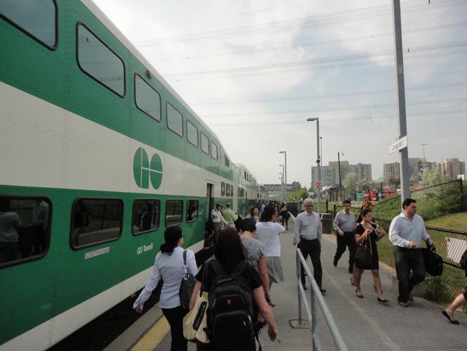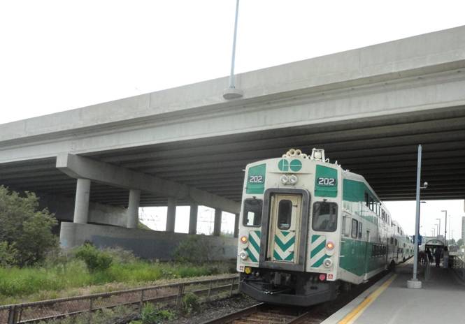 The GO train departed on time and stopped at Oriole and Old Cummer. We stopped by the CN diamond because of a freight train. However, we were soon underway and we stopped at Langstaff. I got off and photographed the GO train.