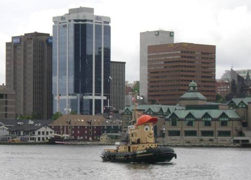 I rode on top in the open air since the weather was good. While on the ferry, I saw the tugboat done up as Theodore Tugboat (of the children’s cartoon of the same name) providing tours of the harbour. For humor purposes, I photographed it.