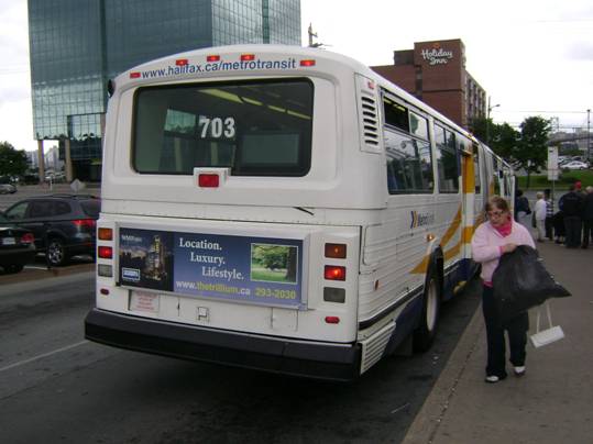 I boarded Articulated Classic #703 and rode back to the Bridge Terminal. I photographed the rear of the bus when I got off.