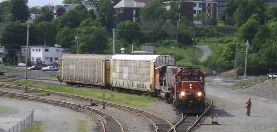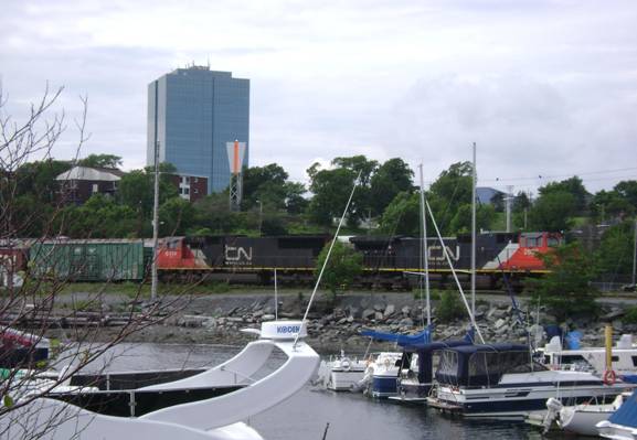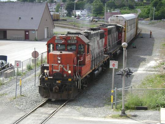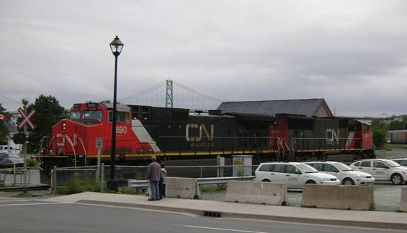 I caught a bus to the ferry dock. I saw the diesels that power the gypsum train begin to move. I walked over to the crossing and photographed them.