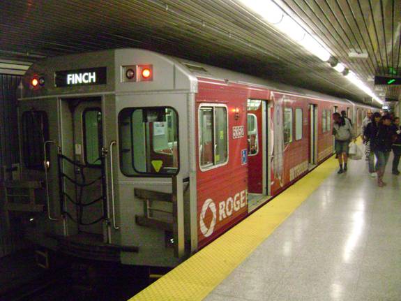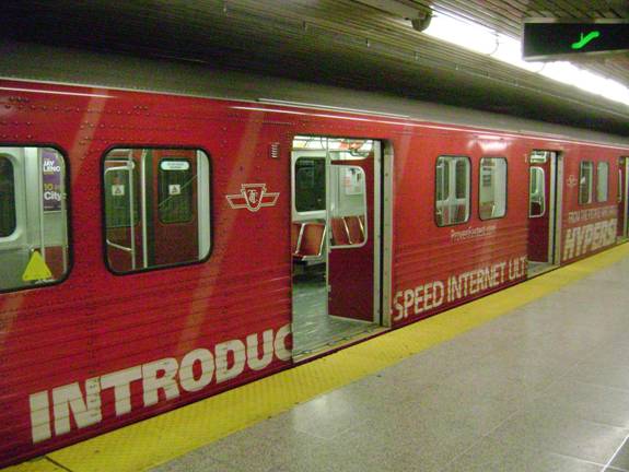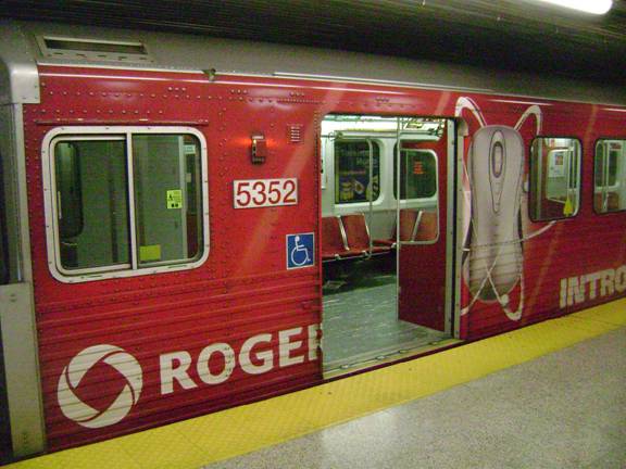 shows TTC class T-1 subway car #5352 with an advertisement wrap ad for