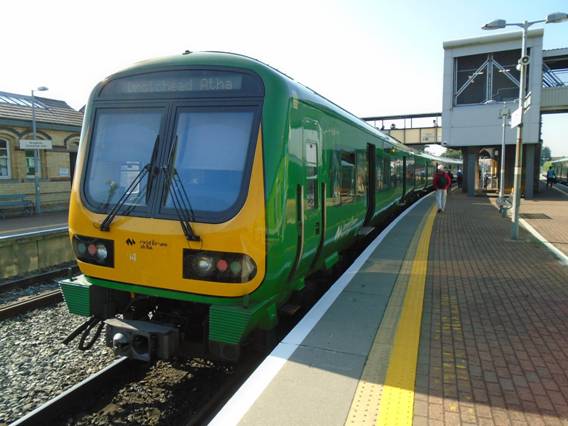 A train passed non stop through the station. We used the footbridge to get to the other side for our departure. A commuter train pulled in going the other way. As it pulled in, I photographed it.