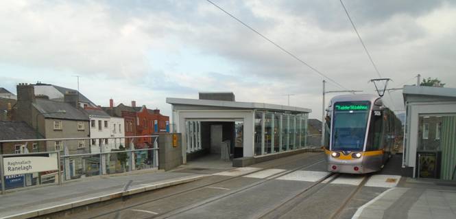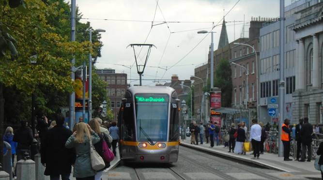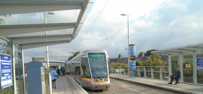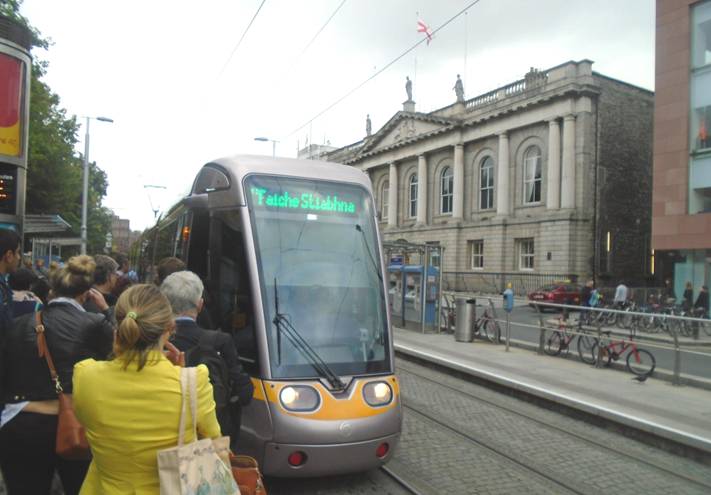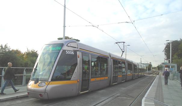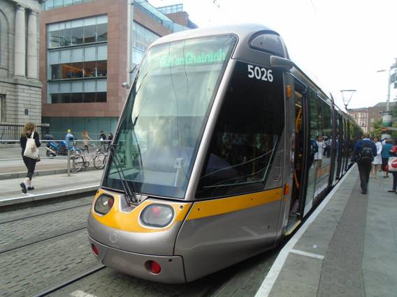We passed by a tall ship in the harbour. We then lay over for a few minutes before we headed into service. After a few stops, Des and I got off. We went to ride the Green Line of Dublin’s light rail system like what I did last year. When we got to the station, I photographed a train when it arrived.