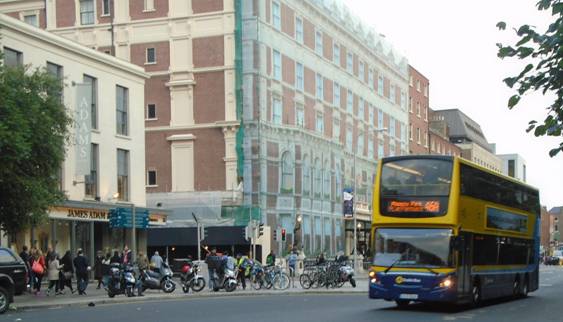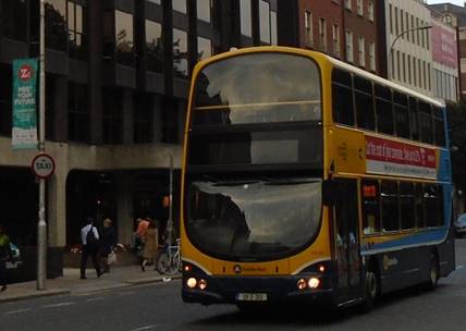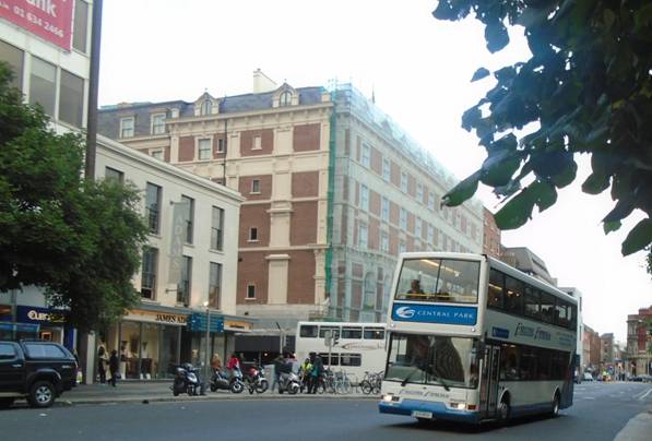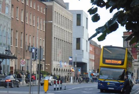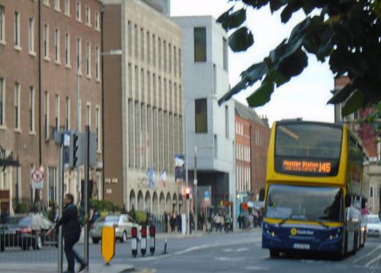 Des and I then left the station. We were hoping to ride a local city bus in Dublin. We had just missed one. I saw a bus on route #18. However, it turned at the intersection before us. We eventually walked a block to get a better look. We saw a bus in the distance, so we walked back to the stop. However, that bus must have turned because it didn’t show up.