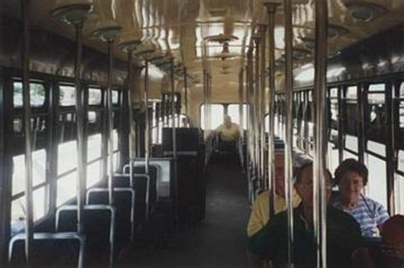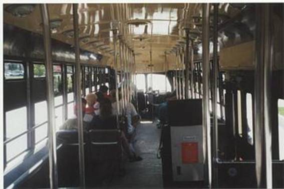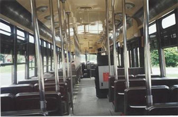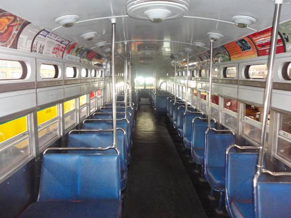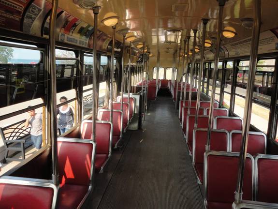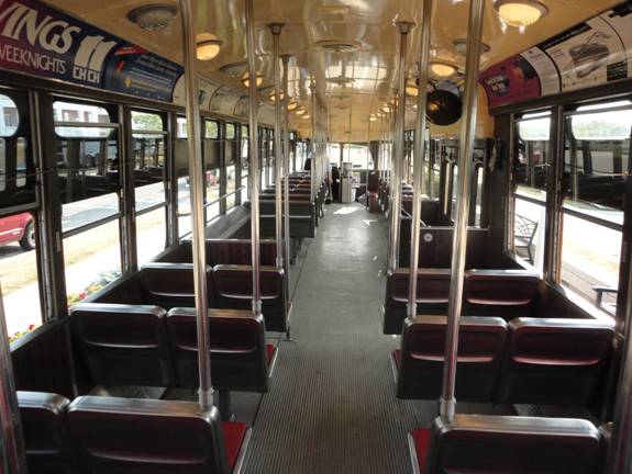 two views shows 4615’s interior in Kenosha. Car 4616 has similar seat cushions.