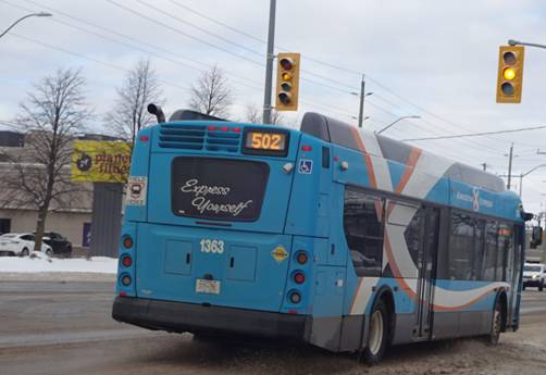 After breakfast I went to catch a bus to the VIA station. As I made my way to the bus stop, I photographed Kingston Transit XD40 #1363 which is done in the express livery. The back of all Kingston Transit express buses has the line “Express yourself” which is kind of cute.